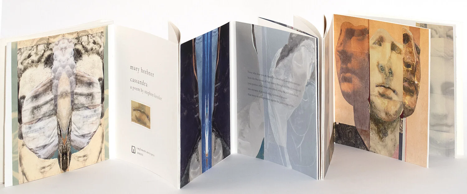 The lines of the poem, Cassandra, are printed letterpress across a fourteen panel accordion fold book, 10” x 10” x 1.50” containing manipulated digital images from the collage series, Veiled/Unveiled by Mary Heebner. Each spread is then individually embellished with collage and pigment. The book lays in a handcrafted powder coated metal box that is laser etched with an image.